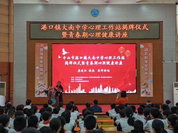 为扎实推进健康中国、教育强国建设,关注学生心理健康,积极开展校园心理咨询服务工作,2023年2月9日上午,由港口镇大南中学德育处主任许春娜主持的港口镇大南中学心理工作站揭牌仪式暨青春期心理健康讲座在学校一楼阶梯室举行,中山市第三人民医院院长蒋廷云、中山市港口镇人民政府副镇长易昊宏、许策明,中山市卫生健康局港口分局局长吴中明、中山市港口镇教体文旅局副局长刘长路、中山市港口镇教育和体育事务中心主任张育文、中山市港口镇大南中学校长廖建红、中山市港口镇社区卫生服务中心副主任卢永添、中山市第三人民医院青少年心理专家张世宁出席本次活动。