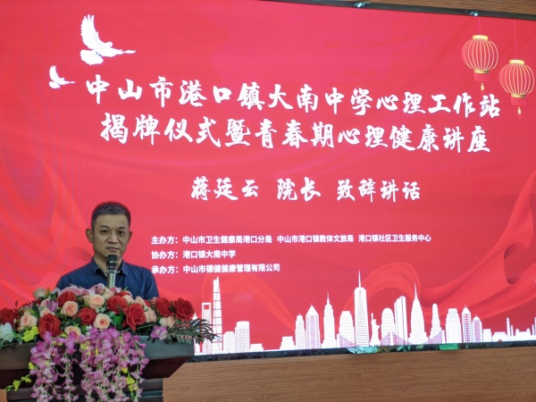 紧接着中山市第三人民医院院长蒋廷云致辞。蒋院长对港口镇政府能尽早开展心理工作站的做法表示由衷的敬佩,他表示心理工作站的成立,也是为心理健康提供一个宣传的平台,让更多的学生和家长知道,心理问题不可怕,可怕的是没有得到处理。没有全民健康,就没有全面小康。