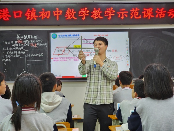 活动主要分为两个部分:教学示范课观摩和议课。活动的第一部分由港口镇大南中学的吴权明老师携手初二(5)班的全体学生,在全镇数学教师面前,别开生面地展开了一场借助数学教具、几何画板和平板电脑融合的智慧教育示范课——《菱形的性质》。吴权明老师借助教具和几何画板,直观形象地揭示了菱形的定义,运用几何画板制作的动画展示了菱形在生活中的应用,激起了学生对菱形学习的兴趣。在充分揭示菱形的性质之后,借助平板电脑进行了辅助教学,通过大数据的统计分析让学生做题情况一目了然,同时提高课堂评价的科学性以及客观性,助力教学评一体化。