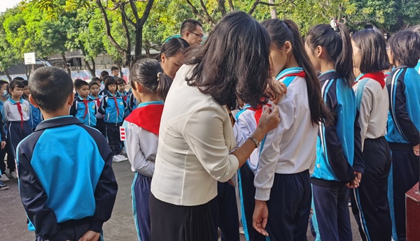 经过激烈的角逐,最终19名少先队员脱颖而出,成为新一届的大队委。10月31日清晨,在庄严的升旗仪式后,大队委授标仪式拉开了序幕。主持人公布了新一届大队委名单,新上任的大队委们在大家期待的目光中大方自信地步上舞台。在全体队员的注目下,在热烈的掌声中,苏少丽校长、梁森明主任、唐慧主任、姚欢欢主任以及詹婉莹主任为新当选的少先队干部们佩戴了大队委标志。此时,他们个个精神抖擞,激动之情溢于言表。
