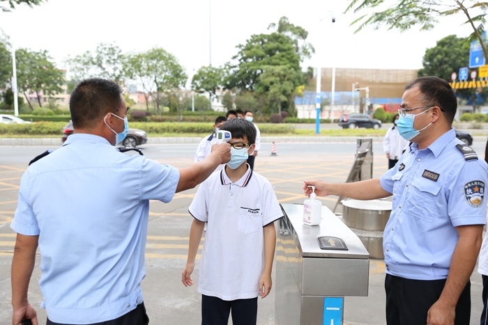 演练正式开始,学生入校前间隔一米,依次通过体温检测、身份核验方可进校;值日老师宿舍门口手持额温枪指引学生进行体温测量,一天三次对进入宿舍师生进行体温检测,异常情况及时报送校医室并处理。学校饭堂提前安排好学生就餐座位,学生就餐前排队,七步洗手、排队取餐、有序就餐、回收餐具、离开餐厅等有条不紊。