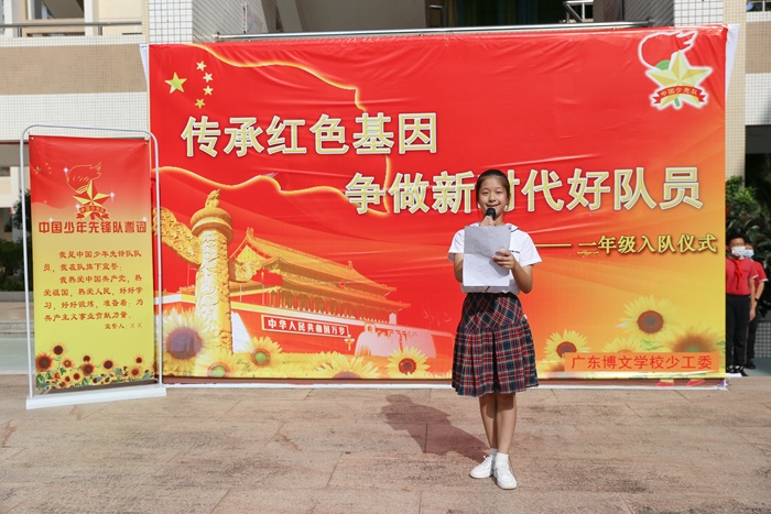 中国少年先锋队是中国少年儿童的群众组织,是建设社会主义和共产主义的预备队。广东博文学校小学部二年级的同学们加入这个优秀的队伍,今后将励志热爱祖国,热爱学习,明理懂事,努力成长为社会主义现代化建设需要的合格人才,做共产主义事业的接班人。