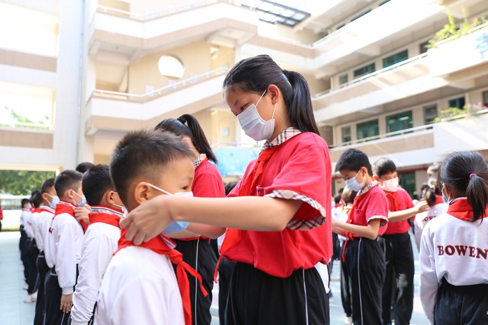 金秋送爽,丹桂飘香。10月16日下午,广东博文学校小学部二年级师生齐聚在学部小广场举行庄重的入队仪式,小学部徐曙校长、徐春艳主任、大队部辅导员蔡斯老师以及二年级全体师生参与活动。秉承着先烈的优良传统,又一批新的队员加入中国少年先锋队。