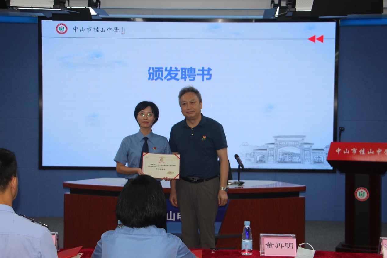 为加强法治教育,落实依法治校,创建和谐安全的校园环境,6月30日下午,桂山中学依托校园电视台举行了法治副校长聘任仪式暨2021-2022学年度下学期法治报告会。中山市人民检察院梁金秀副检察长、第一检察部洪敏桦副主任、三乡镇谷都派出所江剑辉副所长应邀到桂山参加聘任仪式,董再明校长、陈福生副校长、陈建科副主任等领导参加此次大会。