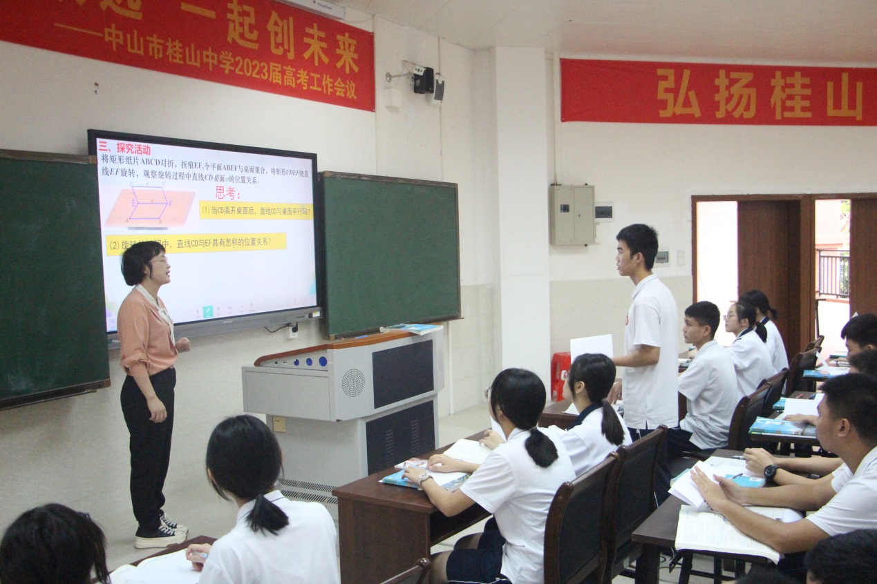本次活动由桂山中学、龙山中学的中山市名师、学科带头人、骨干教师以及教学竞赛获奖教师聚焦同一内容,展现不同风采,提升教师专业发展,打造高质量课堂。市骨干教师刘丹峰、龙山中学备课组长刘丽萍同上数学课《直线与平面平行》,市教学竞赛一等奖教师安娜与市学科带头人袁丹纯同上英语课《必修三Unit3 Welcome to Chinatown》,市骨干教师宋展添与市教学竞赛一等奖教师陈习羽同上物理课《互感与自感》,市教学竞赛一等奖教师郑露萍与市骨干教师黄志刚同上政治课《逻辑思维的基本要求》,市骨干教师赵双与市骨干教师冯树涛同上地理课《人类面临的主要环境问题》,各位优秀教师精心准备、精心设计,针对教学重点,着眼于教学难点,呈现除了一堂堂不同风格的精品课。