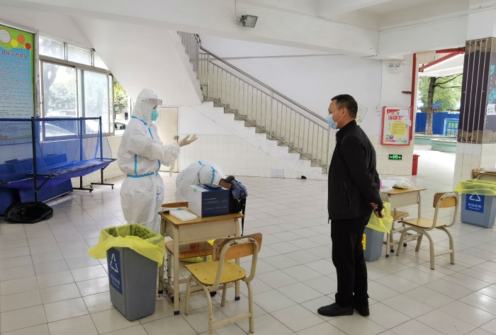 3月23日一大早,古镇镇人民医院的白衣天使们穿着防护服走进校园,教师志愿者们各就各位,为核酸检测工作的开展做好准备工作。