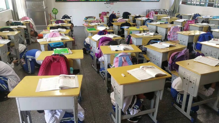 早上8点55分,演练正式开始,第一声长的鸣笛声表示地震发生,学生迅速蹲到桌子下面,用双手保护头部。第二次鸣笛声响起,学生们迅速有序疏散到学校的操场上。学生撤离到安全地点后,各班体育委员及时整理队伍,检查男女生人数,报告班主任,班主任向年级组长报告,年级组长将情况报告总指挥。