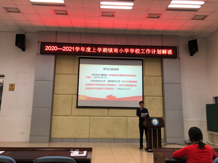 会议由学习三份文件《深化新时代教育评价改革总体方案》、《关于加强和改进新时代学校体育工作的意见》、《关于加强和改进新时代学校美育工作的意见》揭开序幕,接下来杨校长分别从指导思想、工作思想、工作目标、主要工作四个方面对这份计划做了详细解读。