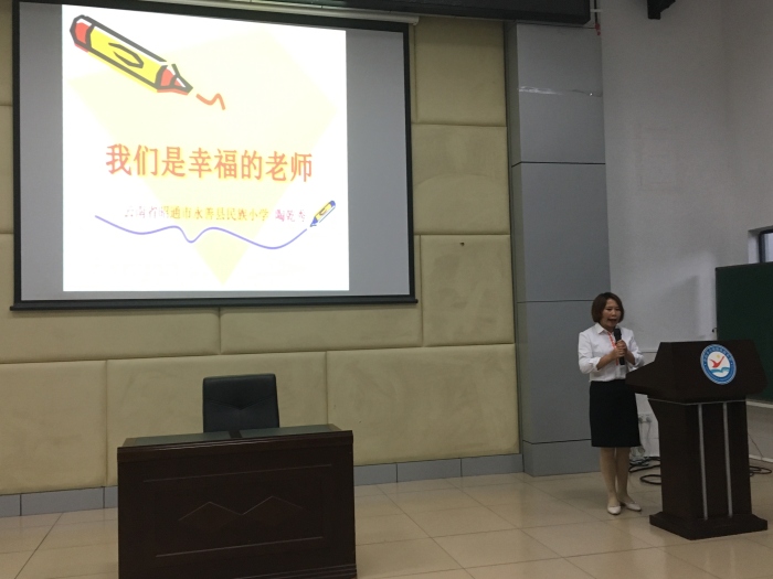 随后,来自云南永善县民族小学的陶乾秀老师以《星空体育是幸福的老师》为主题发表了讲话。陶老师首先感谢了镇南小学在这段时间的悉心照顾和热情指导,在这将近一个月的学习过程中,她更加感受到做一个人民教师的使命与担当,更加领略到做一个人民教师更要做到包容、坚持、创新与开拓,更加感觉到做一个人民教师的光荣、骄傲与幸福。接着陶老师分享了她三十年从教生涯中的点点滴滴,从一个个生动具体的事例中,教师们看到了陶老师的积极和乐观,感受到了陶老师对学生的关心与热爱,更深切地体会到陶老师对教师职业的骄傲与自豪。就如陶老师所言“星空体育所从事的职业是在创造世界,星空体育所收获的是任何数字都无法计算的生命价值和幸福成果。”