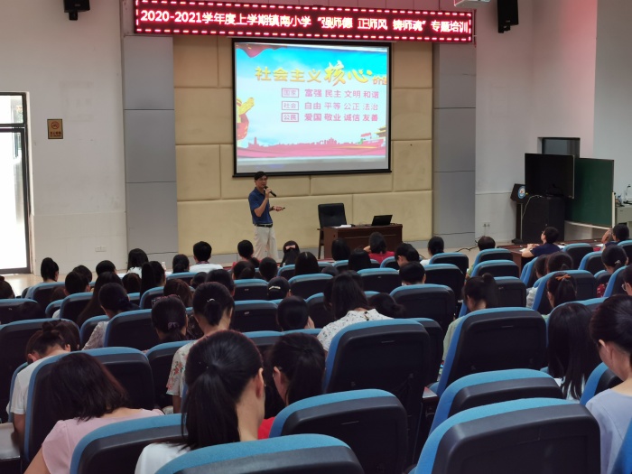 为进一步贯彻党的教育方针,推进师德师风建设活动的深入开展,9月11日,镇南小学杨红卫校长在报告厅召开了以“强师德,正师风,铸师魂”为主题的师德师风专题培训会,全体教师参加了此次会议。