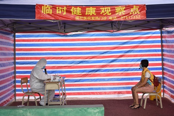 本次演练,项目包括师生正确佩戴口罩入校,校门口分流测温,发现体温异常学生的处置;课堂上发现学生有咳嗽、体温超过37.3度等异常现象时的应急处置等项目。返校时,一旦发现学生发烧,将立刻送到健康观察室,由保健老师进行复检,将情况通知家长并上报横栏医院和疾控中心。如果课堂上学生出现发烧、咳嗽等症状时,任课老师将严格依照上报流程进行处理。最后,横栏镇第二小学卫生副校长、横栏医院疾控科主任何波为本次复学演练进行总结。何主任强调入校门发现学生体温异常需与家长联系,再次确认三史情况,报告家长学生情况后拨打120送医院;课堂发现学生体温异常,带学生出课室门口需再次进行手消毒,加戴一次性外科口罩,保健医生要穿隔离服;学生送医后,观察室需要使用紫外线严格消毒。