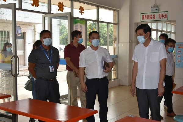 督导组一行实地察看了入校门口、测温通道、健康观察室、卫生保健室、洗手间、食堂等重要场所。吴国梁校长就学校返校健康监测、晨午检记录、饭堂就餐秩序及就餐方式、卫生防疫消毒、应急处理办法、防疫防控物资准备、校园封闭管理等工作向督查组做了具体汇报。