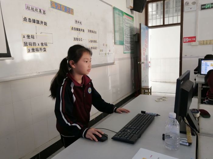 本次活动先由三沙小学潘璀秀老师执教课例《海洋保卫战》。潘老师以任务驱动的形式,结合小组合作的方法,层层递进,引导学生学会使用克隆指令控制角色、理解坐标的设置方法。整节课课堂气氛活跃,调动了学生的思维,让学生成为了课堂的“主人”。