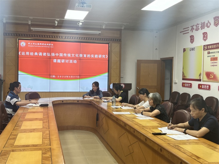 5月27日上午,中山市火炬科学技术学校语文科组开展了以“运用经典诵读弘扬中国传统文化教育的实践研究”为主题的课题研讨交流活动。语文学科组长廖锡其老师带领课题组语文教师共同学习了信息技术提升工程2.0校本研修的具体要求,探讨了课题的进展情况及下阶段的努力方向,并重点围绕运用经典诵读在语文教学上的具体实施策略进行了分享交流。