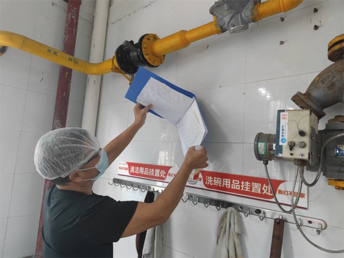 在检查过程中,检查组每到一处都认真查验、察看,并听取食堂负责人的详细介绍。本次检查重点包含人员疫情防控、食材静置、食品安全管理、健康管理、索证索票、清洗消毒、加工制作、环境卫生、饮水管理、采购验收、入库出库及燃气安全等方面。检查结果显示,学校食堂疫情防控措施落实到位,环境卫生情况整体良好,餐饮具清洗消毒规范,食品进货查验索证索票、食品贮存、加工制作、留样规范、燃气安全等方面都能做到规范自查。