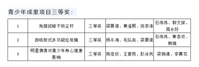 本次大赛由市科协、市教体局、市科技局、团市委、市文明办联合主办,根据大赛竞赛规则,经评审委员会评审,共评出获奖项目397项。其中,科技创新成果项目一等奖63项、二等奖86项、三等奖154项;优秀辅导员科技创新成果项目一等奖15项、二等奖22项、三等奖37项;十佳优秀科技教师10名;优秀组织奖10项。