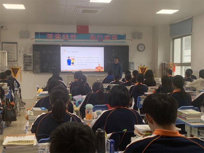 在各班主题班会课上,班主任围绕着“什么行为属于校园暴力、校园暴力的严重后果、如何防范和应对”等三个方面展开话题,并结合多媒体PPT内容以及网络链接上真实的案例,共同剖析了校园内外校园欺凌的类型、危害以及引发的原因和主要责任,层层递进地引导学生学会如何理智的应对校园暴力,积极引导学生运用正确的方法处理好同学间的矛盾和问题,增强学生自我保护的意识,最大化的提高自己生命安全。