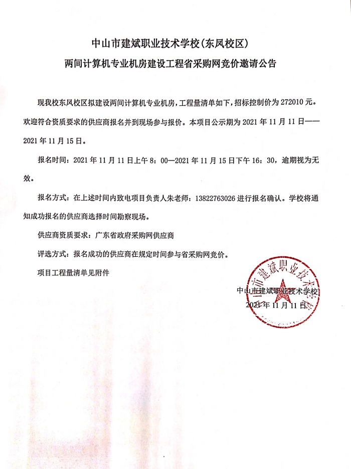 中山市建斌职业技术学校(东凤校区)两间计算机专业机房建设工程省采购网竞价邀请公告