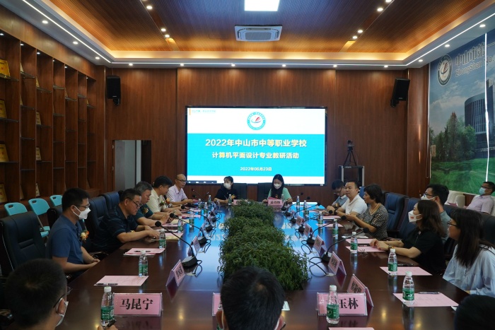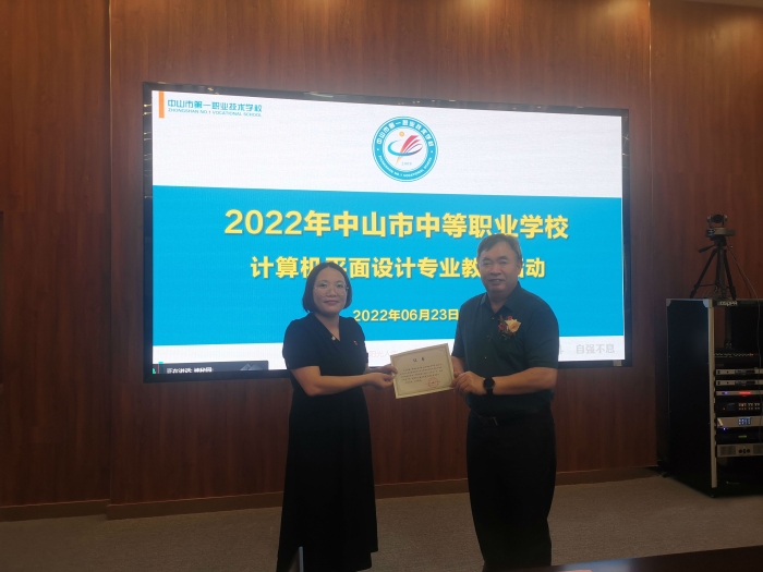 6月23日上午,由市教研室主办的中山市中职学校计算机平面设计专业教学研讨活动在中山一职举行。本次活动包括一场毕业展、一节公开课、一场研讨会,旨在展示中山一职2020级毕业生学习成果,交流碰撞,探讨“教学做一体”相融合的教学与成果展示模式在中职学校计算机平面设计专业中的应用。教研员陈建国老师率领全市中职学校计算机平面设计专业骨干教师出席活动,中山一职副校长章利建,教务处主任林辉,教务处副主任何彩梅、侯敬熙,新光源技术部部长黄娟,中山市印艺快线数码图文有限公司经理李明杰,六盘水市水城区职业技术学校三位跟岗教师,及部分家长、学生参加了活动。