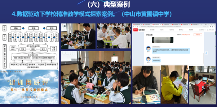 中山市黄圃镇中学通过“建、训、用、研、评”的推进模式开展空间应用。“读书郎”教学平台为该校提供贯穿“教、学、考、管、评”全过程的特色空间,学科教师可实施自主、协作、探究等教学活动,并利用空间开展课内课外、线上线下相结合的混合式教学,差异化和个性化教学与指导。借助中山教育信息港数据融合和开放生态功能,该校实现了学生基础数据与读书郎平台数据对接,科学全面地掌握师生教学情况,形成深度精准的“三段十环”教学模式。该校被评为广东省信息化中心学校成效评价优秀学校,列入为广东省基础教育成果奖培育对象学校。