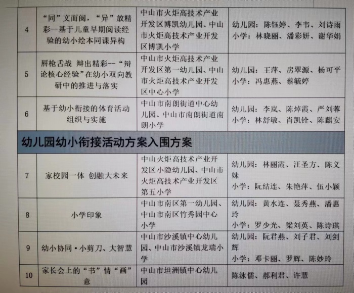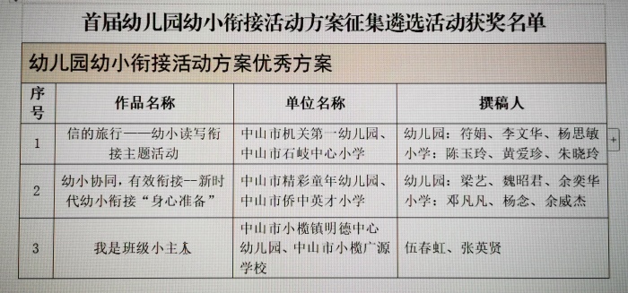 2023年5月5日,在广东省教育厅公布的《广东省首届幼儿园自主游戏活动案例和幼小衔接活动方案征集遴选结果》中,中山市有12个自主游戏活动案例和10个幼小衔接案例榜上有名。据了解,全省共遴选出自主游戏活动优秀案例86篇,入围案例138篇;幼小衔接活动优秀方案80篇,入围方案145篇。中山市此次选送自主游戏活动案例15个,其中6个获评优秀案例,6个获评入围案例;选送幼小衔接活动方案15个,其中6个获评优秀方案,4个获评入围方案(获奖名单见附件)。