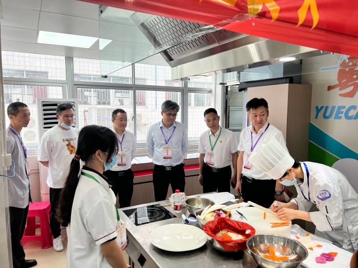 为保障大赛的顺利举行,市现代职业技术学校高度重视,会同上级主管部门、企业、行业专家多次召开工作推进会。学校共组织培训学生志愿者180余名,教师志愿者90余名,确保各个环节的服务工作全覆盖、高质量,为参赛选手提供1对1服务。赛场开展现场网络直播,营造“公平、公正、公开”的竞赛氛围,同时弘扬了粤菜文化。比赛期间,广东省教育厅大赛办覃忠健与大赛督察梁海波巡视赛场比赛情况,充分肯定学校的协办工作。