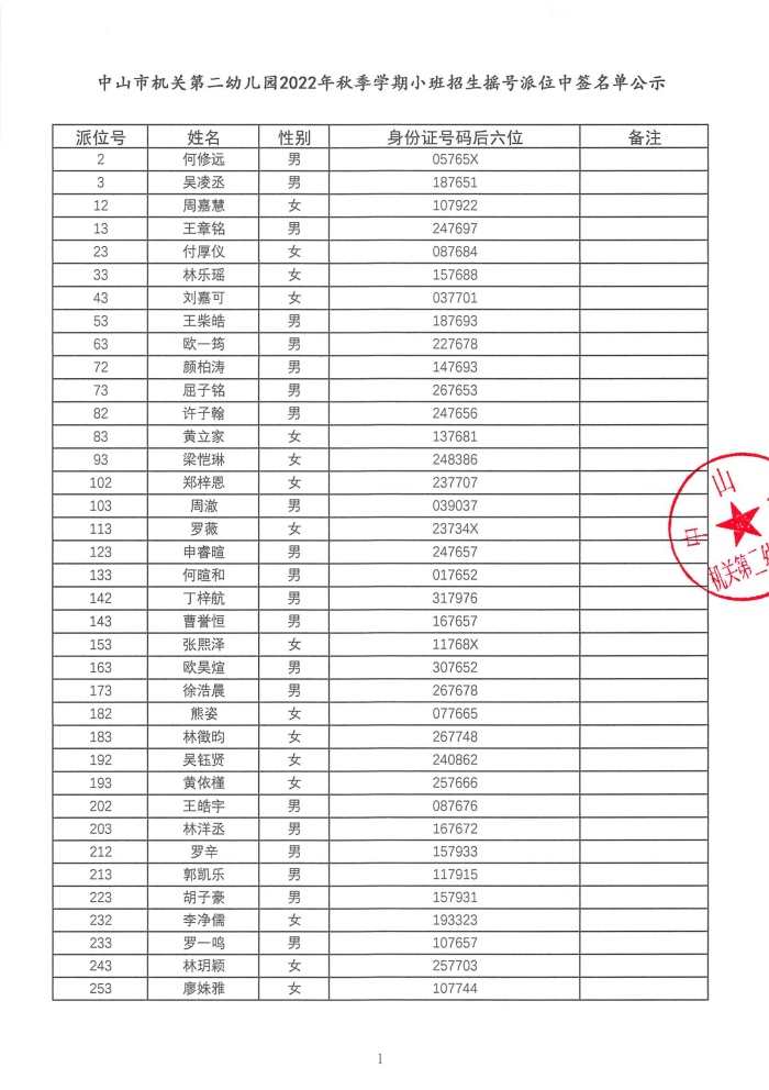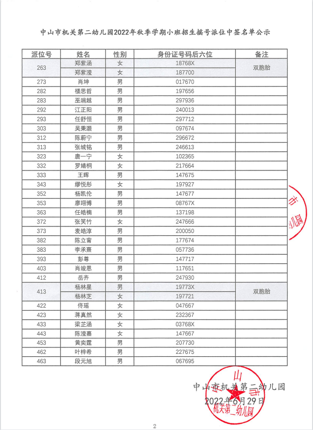 中山市机关第二幼儿园2022年秋季学期小班招生摇号派位中签名单公示