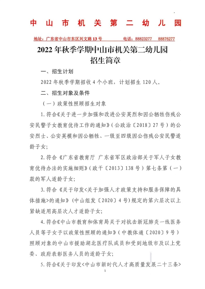 2022年秋季学期中山市机关第二幼儿园招生简章.pdf