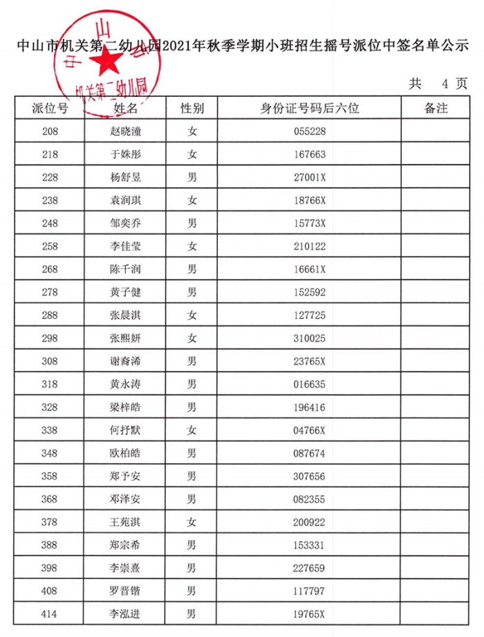 中山市机关第二幼儿园2021年秋季学期小班招生摇号派位中签名单公示