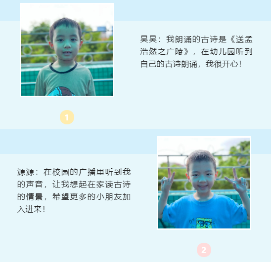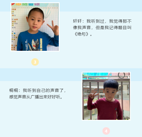 在“小小朗诵家”活动中,孩子们朗诵喜爱的、积极向上的文学作品并录制音频,星空体育将收到的98个音频在幼儿园广播时段进行播放。