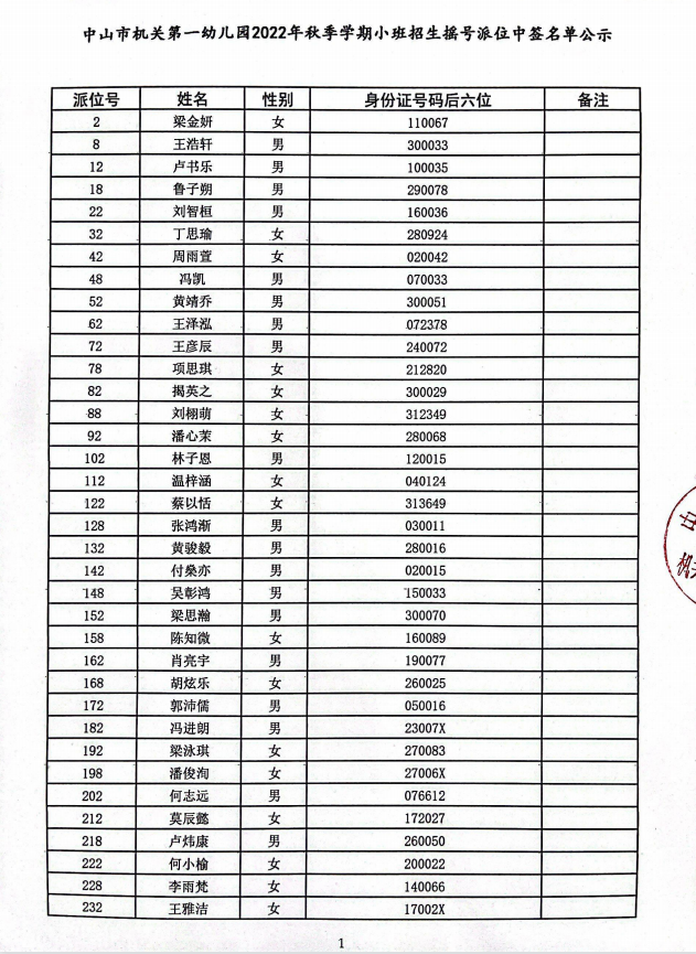 中山市机关第一幼儿园2022年秋季学期小班招生摇号派位中签名单公示