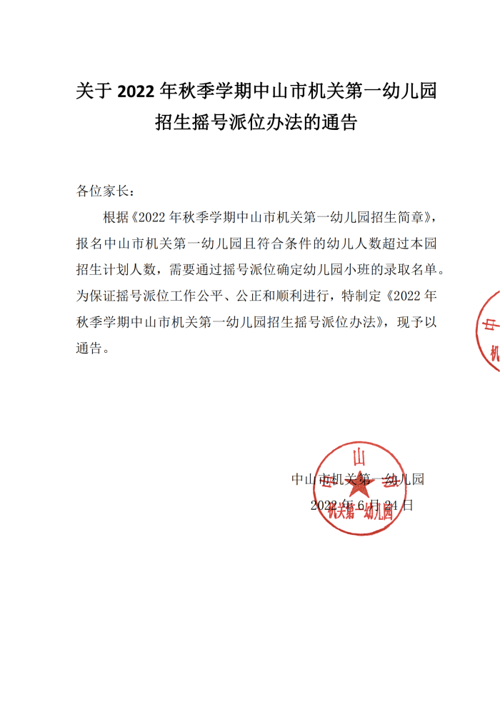 关于2022年秋季学期中山市机关第一幼儿园招生摇号派位办法的通告