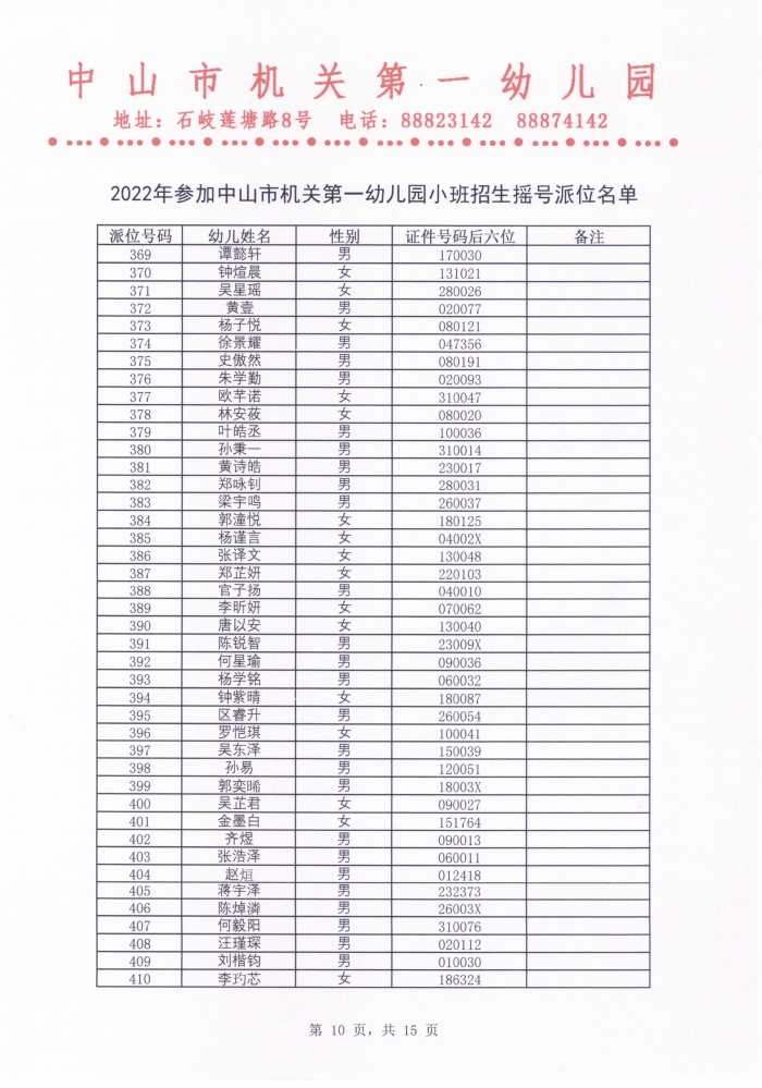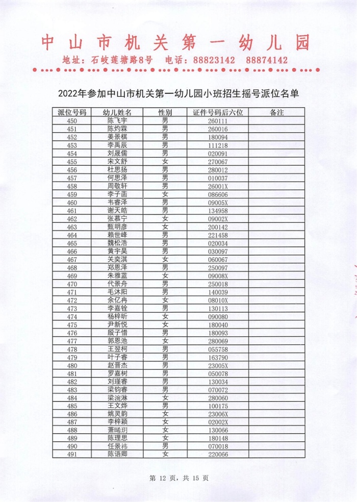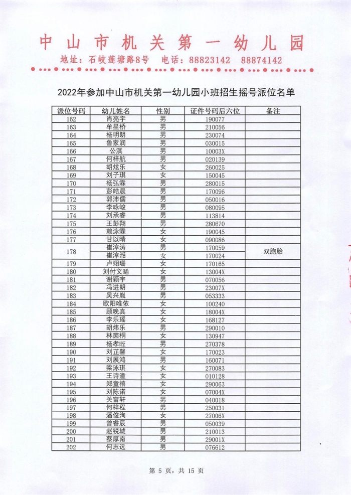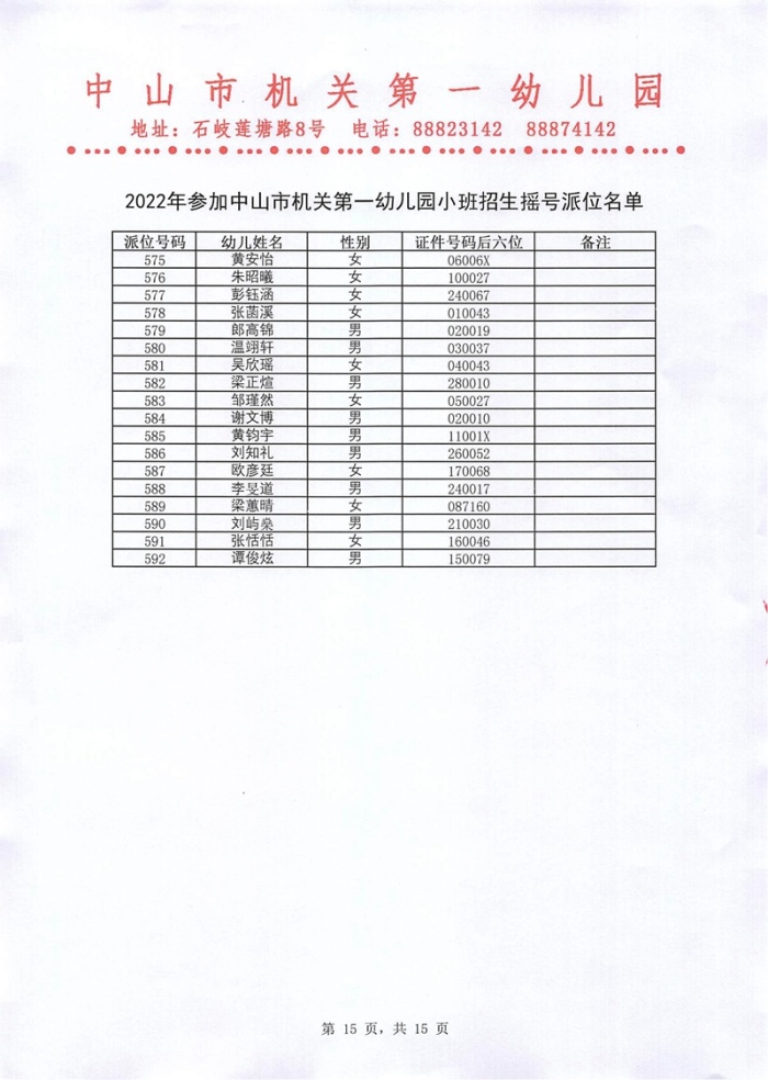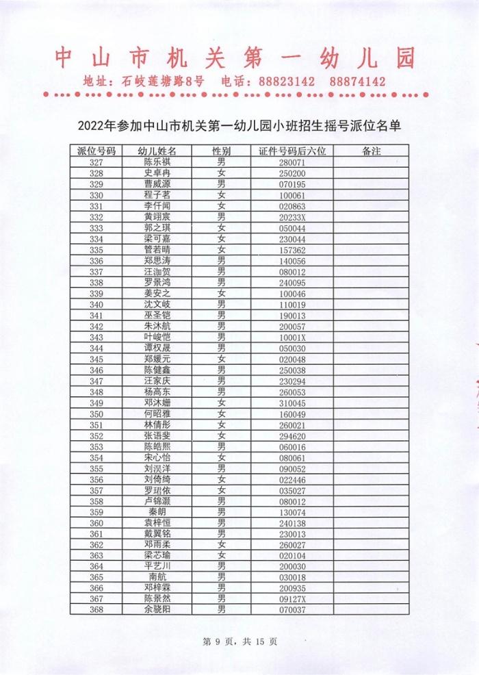 2022年参加中山市机关第一幼儿园小班招生摇号派位名单公示