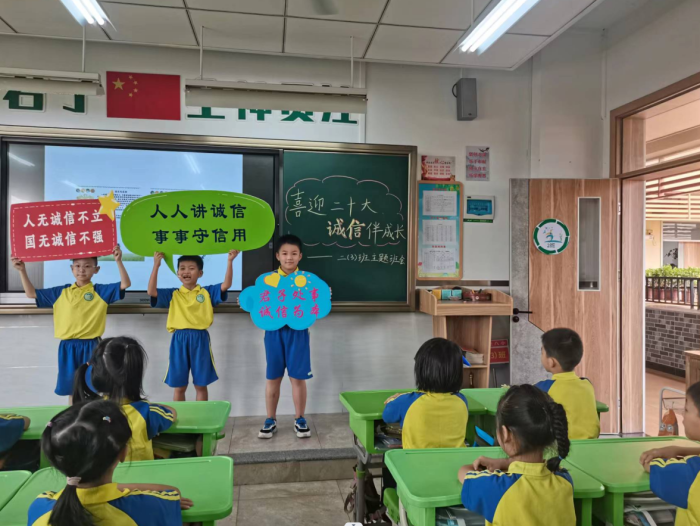 君子立言,一诺千金;君子处事,诚信为本。诚信是中华民族优秀传统美德,是做人立身立德之根本。为弘扬诚信立德之风,营造“做诚信人、说诚信话、做诚信事”的校园氛围,根据中山市教育和体育局关于开展“诚信宣传进校园”活动的要求,结合八小“君子文化”办学特色,火炬开发区第八小学于9月23日开展“喜迎二十大 诚信伴成长——诚信宣传进校园”教育活动,教育学生做到知行合一,使诚信观念扎根校园,深入人心,以实际行动迎接党的二十大胜利召开。