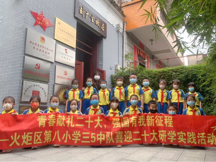为迎接党的二十大胜利召开,深入贯彻落实习近平新时代中国特色社会主义思想,引导队员们自觉从党的重大成就和历史经验中增长智慧,增强信心,用青春唱响“强国复兴有我”的时代强音,在第八小学党支部的指导下,5月22日上午,火炬区第八小学大队部开展喜迎二十大研学实践活动,以三5中队为代表的队员们深入挖掘中山本土红色教育资源和红色革命遗址,汲取奋进力量。