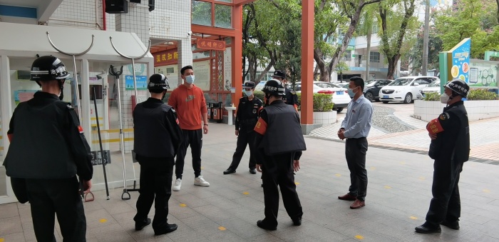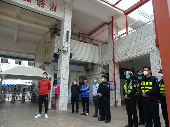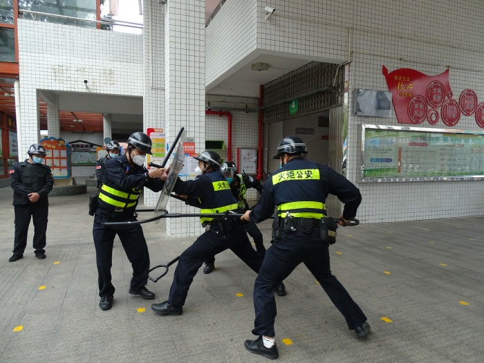 参加本次演练活动的主要人员有:张家边派出所民警、学校保安人员、学校护校队成员。活动开始,郑康乐副校长与朱亮副主任首先代表学校对肖友良警官等一行人表示了欢迎与感谢。肖友良警官一行与学校安全负责人进行了深入的校园安全工作交流,并提醒相关注意事项,肖友良警官表示会全力支持校园安全相关工作。