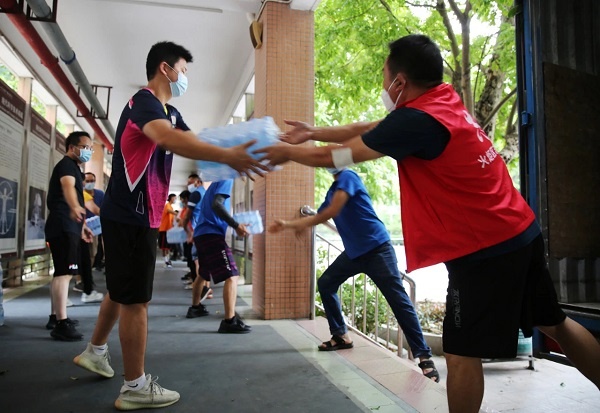 7月25日,六小两名党员志愿者进入集中安置点,对隔离宿舍进行物资分配及卫生清洁。当天高温黄色预警,志愿者们的汗水早已把衣服浸透,却依然坚守岗位,打扫宿舍,完成生活物资的搬运及分发。