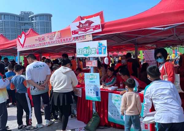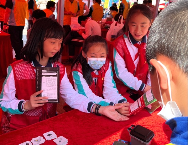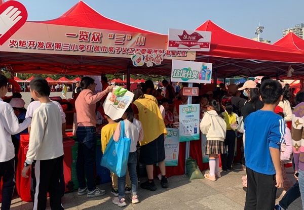 现场气氛活跃,火炬三小的红领巾宣讲团摊位,特色十足,垃圾分类展板、学习强国标语醒目,吸引大批市民驻足。参加垃圾分类闯关小游戏和现场搜索学习强国节目大闯关趣味活动的市民络绎不绝,小志愿者们认真引导,忙得不亦乐乎。小小志愿者们还拿着垃圾分类的宣传单走到摊位外面,走到人群中进行派发和宣传。