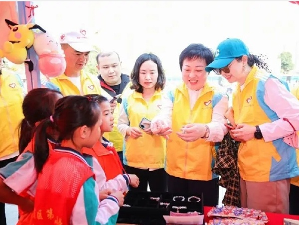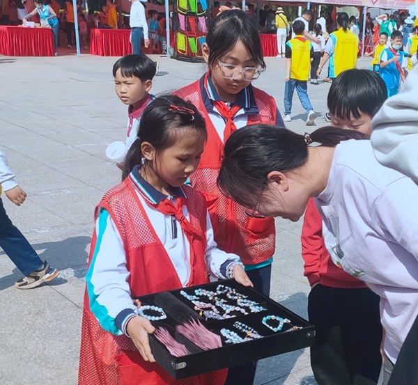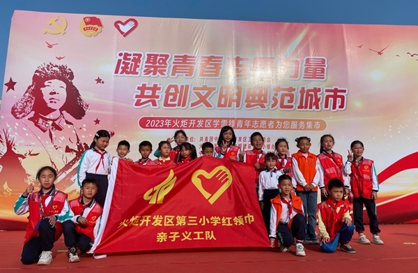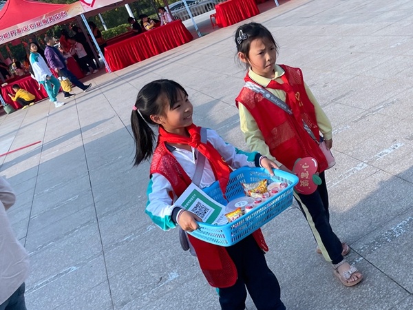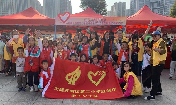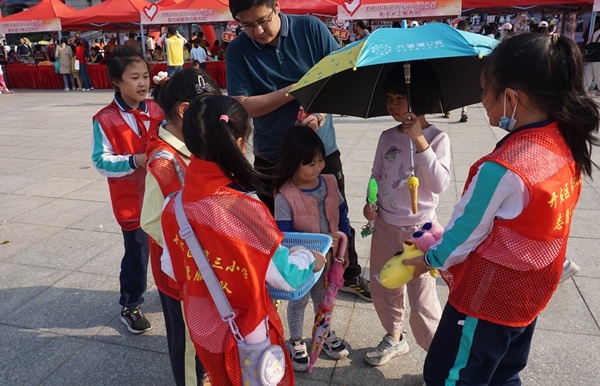 当天下午,太阳城广场举行的志愿者服务集市活动像当空的骄阳,如火如荼、热闹非凡。火炬三小亲子义工队的一览众“三”小义卖摊位和红领巾宣讲摊位上,站满了大大小小的志愿者,红红的桌布上放着琳琅满目的活动物品。