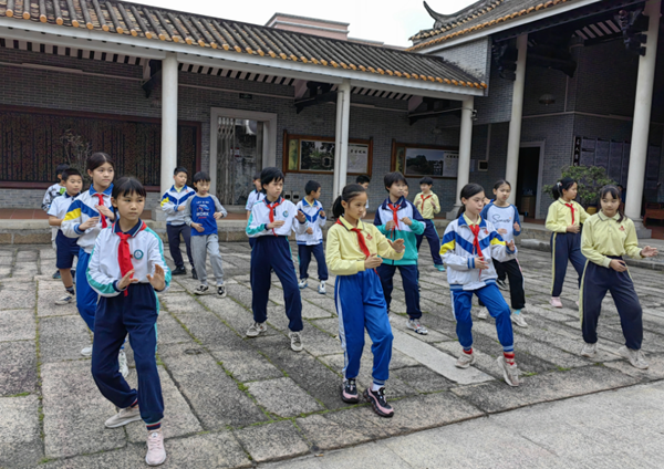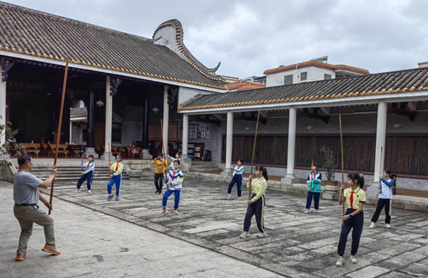 学习中,队员们精神抖擞地跟着校外辅导员老师学习“濠头郑家棍”二十四式棍法,扎马步、握棍、挥棍,一招一式扎实练,动作有板有眼、气势昂扬。