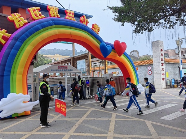 一大早,三小的老师们就守候在校门口,迎接学子们的归来。社区民警和身穿红色马甲家长志愿者们守护学生入校安全,入校秩序规范有序。