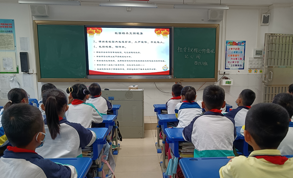 各班从爱国意识、文明意识、诚信意识、友善意识几个方面,阐释了当代中小学生应当具备的核心价值观。结合生活实际,师生共同探讨了“校园中存在的不文明现象、怎么样才能做到文明?”等问题,让社会主义核心价值观的真正意义在孩子心中得以内化。