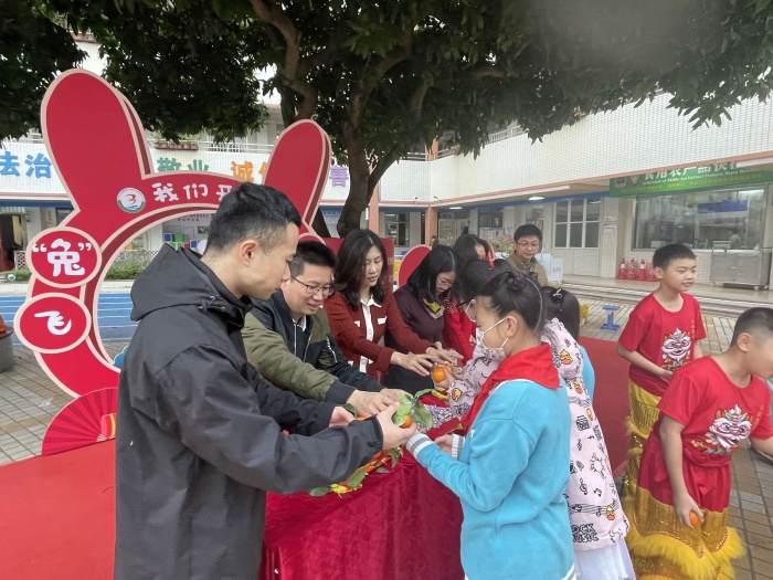 早上7时15分,学校行政携同醒狮社团、少先队干部在校门口迎接学生返校,并为学生们送上桔子和大白兔糖,寓意五小学生在兔年“大吉大利”大展宏“兔”。