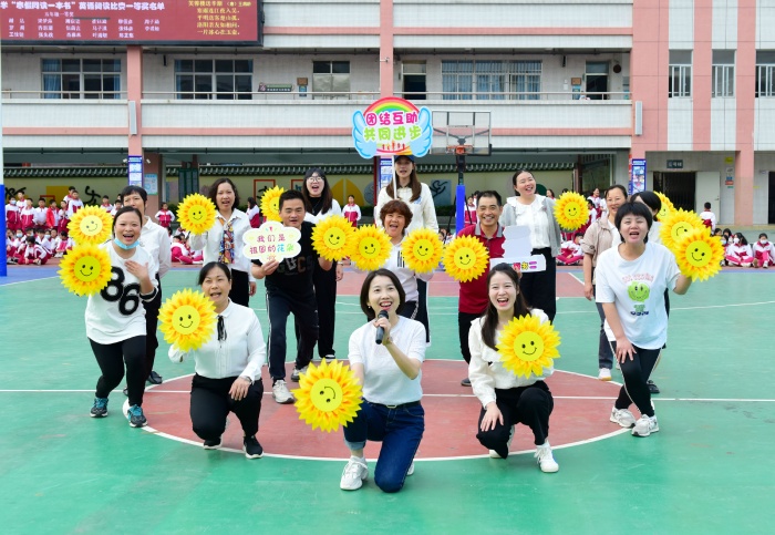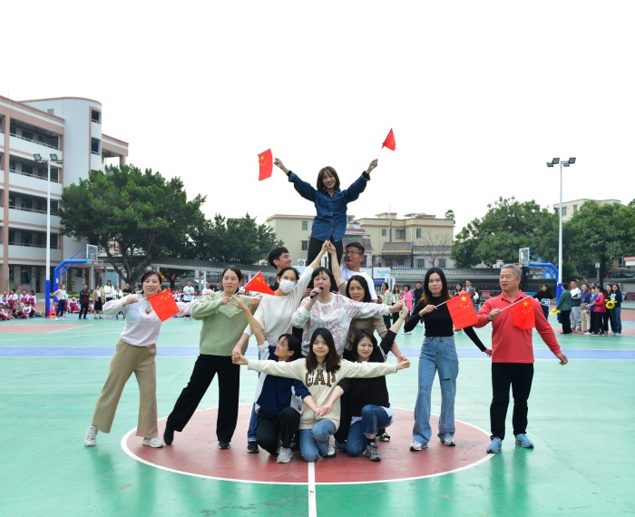 7:50左右,全体学生聚集在操场的外围,和全体教师一起庆祝美好的节日。在吴君丽副校长的组织下,一、二、三、四、五、六年级六支队伍积极开展多姿多彩的庆祝活动。庆祝活动包括“心手相牵共成长”、“欢乐传递共分享”(U型槽传球游戏)、“感恩相伴共同行”(齐心协力摆造型)。全体教职工奋勇争先为荣誉而战。他们齐心协力,朝气蓬勃,赛出了魅力,拼出了精彩,也将团结一致、斗志昂扬的精神发挥得淋漓尽致。运动会上加油声、呐喊声、欢笑声此起彼伏。