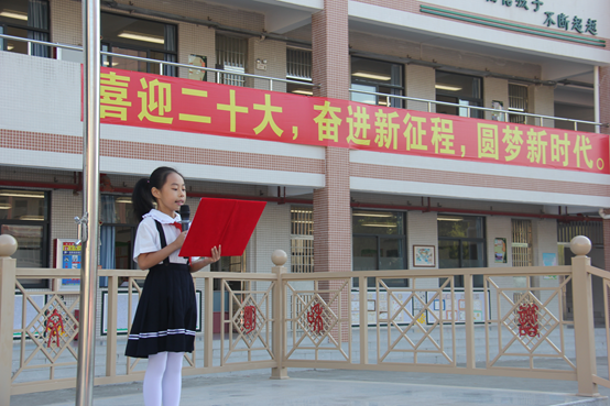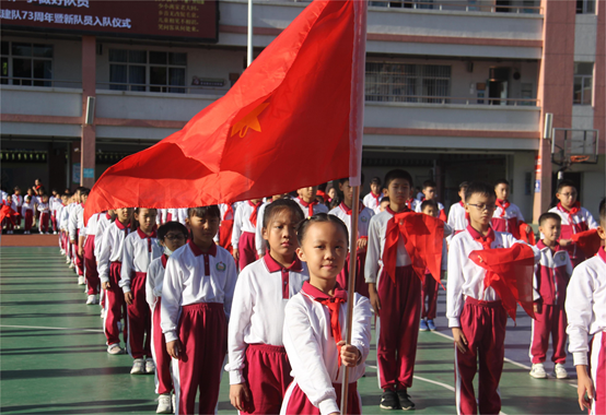 五星红旗高高飘扬,十月的校园秋高气爽,生机盎然。胸前的红领巾格外鲜艳,映照着一个个美丽的脸颊。出队旗,唱队歌,六年级的老队员为一百多名新队员佩戴红领巾,孩子们的脸上洋溢着自豪和骄傲。紧接着,少工委副主任康乐讲话,他指出,希望少先队员们积极行动起来,争当热爱祖国、理想远大的好少年;争当勤奋学习、追求上进的好少年;争当品德优良、团结友爱的好少年;争当体魄强健、活泼开朗的好少年。