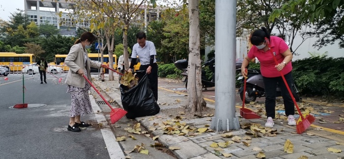 瞧!可爱的老师、家长们先对幼儿园周边环境进行清扫,大家手拿劳动工具和垃圾袋,对散落的树叶进行清扫,并及时排查幼儿园周边的安全隐患。在大家相互合作、相互配合下,让幼儿园的周边区域变得干净又整洁,那忙碌的身影是街道上一道靓丽的风景线。