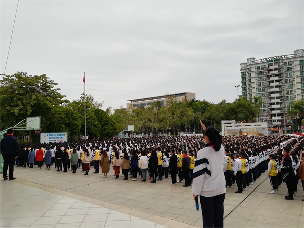 2月14日,中山纪念中学火炬一中新学期第一周升旗仪式如期举行。仪式由初二(11)班贾曦雯同学主持。