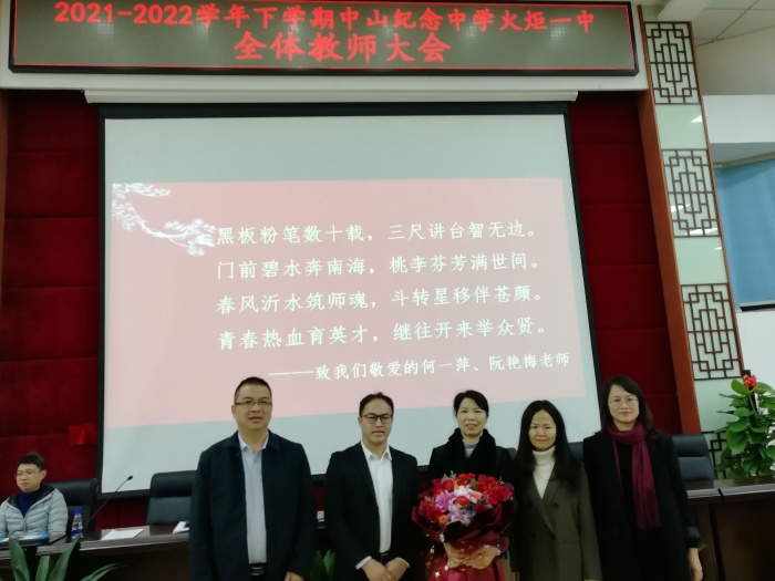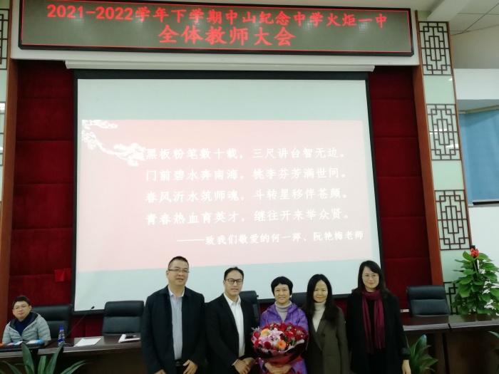 接着,举行了情深意切的欢送退休教师仪式。校党总支书记、副校长程炜敏向何一萍、阮艳梅两位退休教师献上鲜花。四位校领导分别与两位退休教师合影留念。