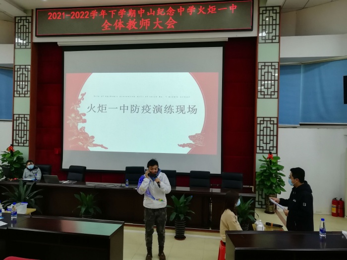 最后,学校防疫专班在会场进行了防疫演练,模拟“课堂”上有学生发热,科任教师、班主任、校医、家长如何进行转送处置流程。旨在教会老师们若遇到类似情况,要正确熟练操作处置规程,做好校园防疫工作。