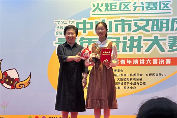 中山纪念中学火炬一中党总支积极响应大赛活动,校团委精心组织和动员全体学生踊跃参加。经过校级的筛选,多名学生代表参赛。初三15班陈欣怡同学脱颖而出,围绕主题,结合自身经历,深情讲述身边人的正能量故事,表达了新时代青年的坚定信念,呈现出一代新人笃行不怠、一往无前的昂扬姿态。比赛现场气氛热烈,同学们的精彩表现赢得了现场的阵阵掌声。经过评委的现场打分评定,恭喜初三15班陈欣怡荣获“学习二十大 永远跟党走 奋进新征程”中山市文明风尚青年宣讲大赛火炬区分赛区第一名,学校团委荣获最佳组织奖。